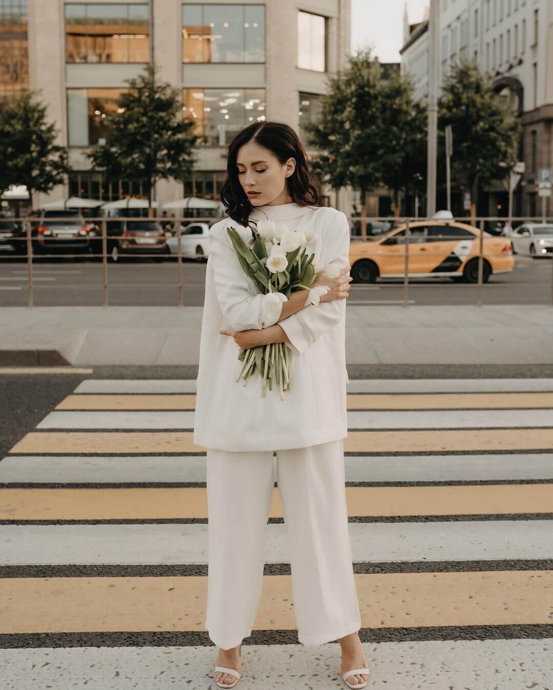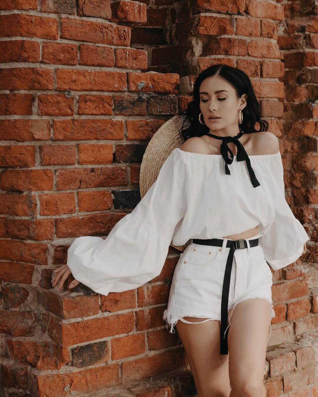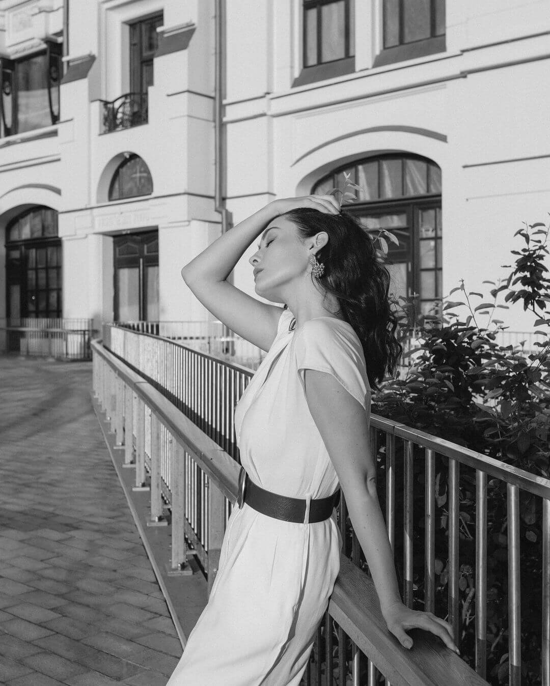 Камера улавливает контрасты: городской фон на фоне утончённого силуэта, кирпичные стены, хранящие тепло её отдыхающего тела, и свет, который не доминирует — а обнимает. Белая одежда преобладает — не как пустота, а как холст. Она отражает спокойствие, но также силу оставаться верной себе.