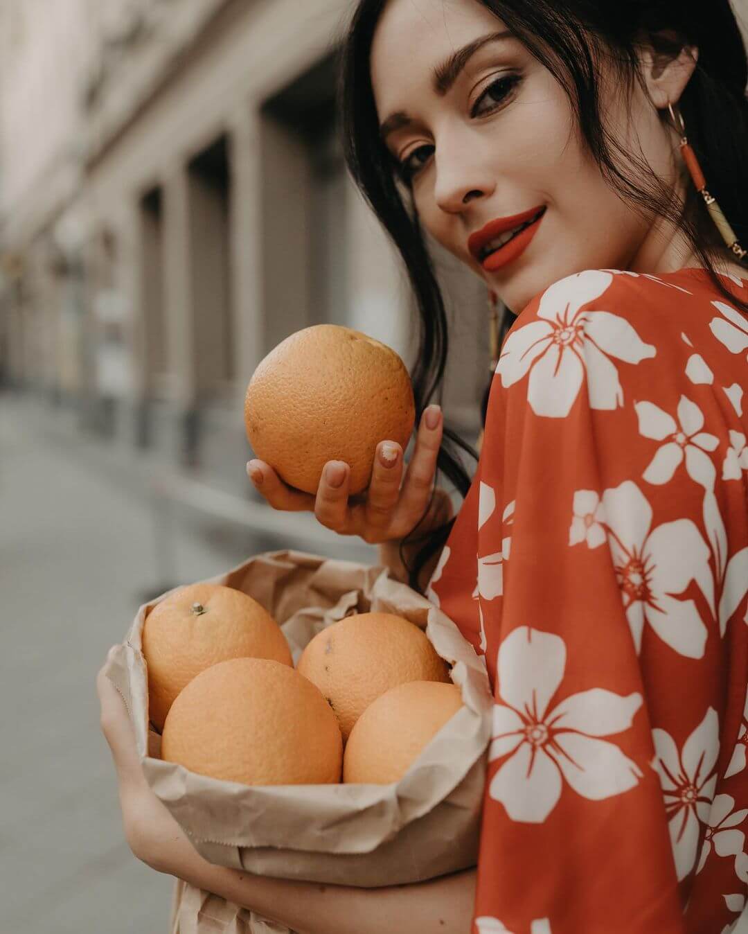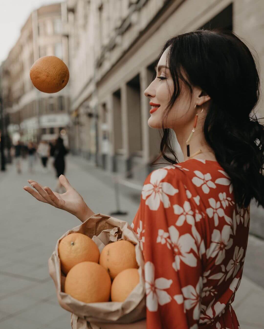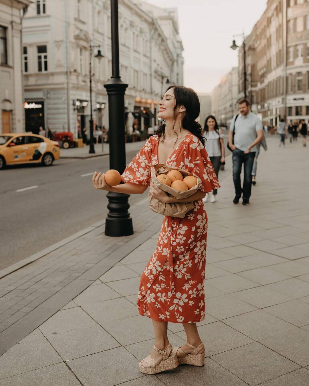 Есть и игривая, цветная сторона этой съёмки. В этом мире Саша не «носит» сцену — она позволяет ей играть с собой. Её руки держат апельсины, улыбка непринуждённа, а платье расцветает, как само лето. Фотограф здесь не управляет кадром — он мягко наблюдает, словно документируя мгновение радости.