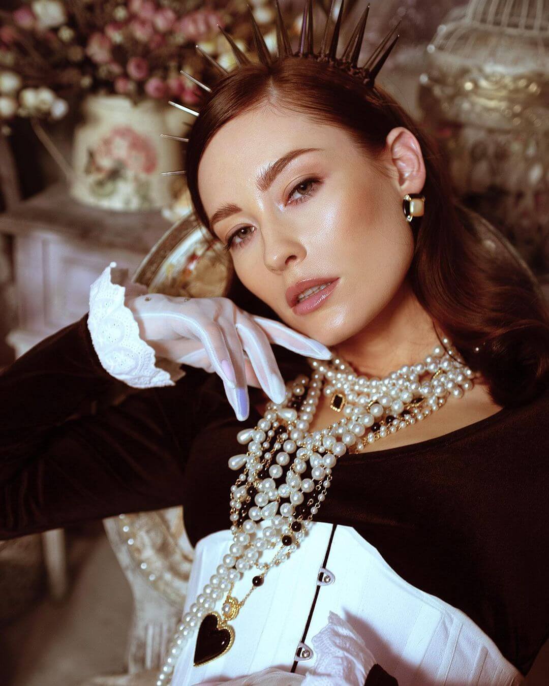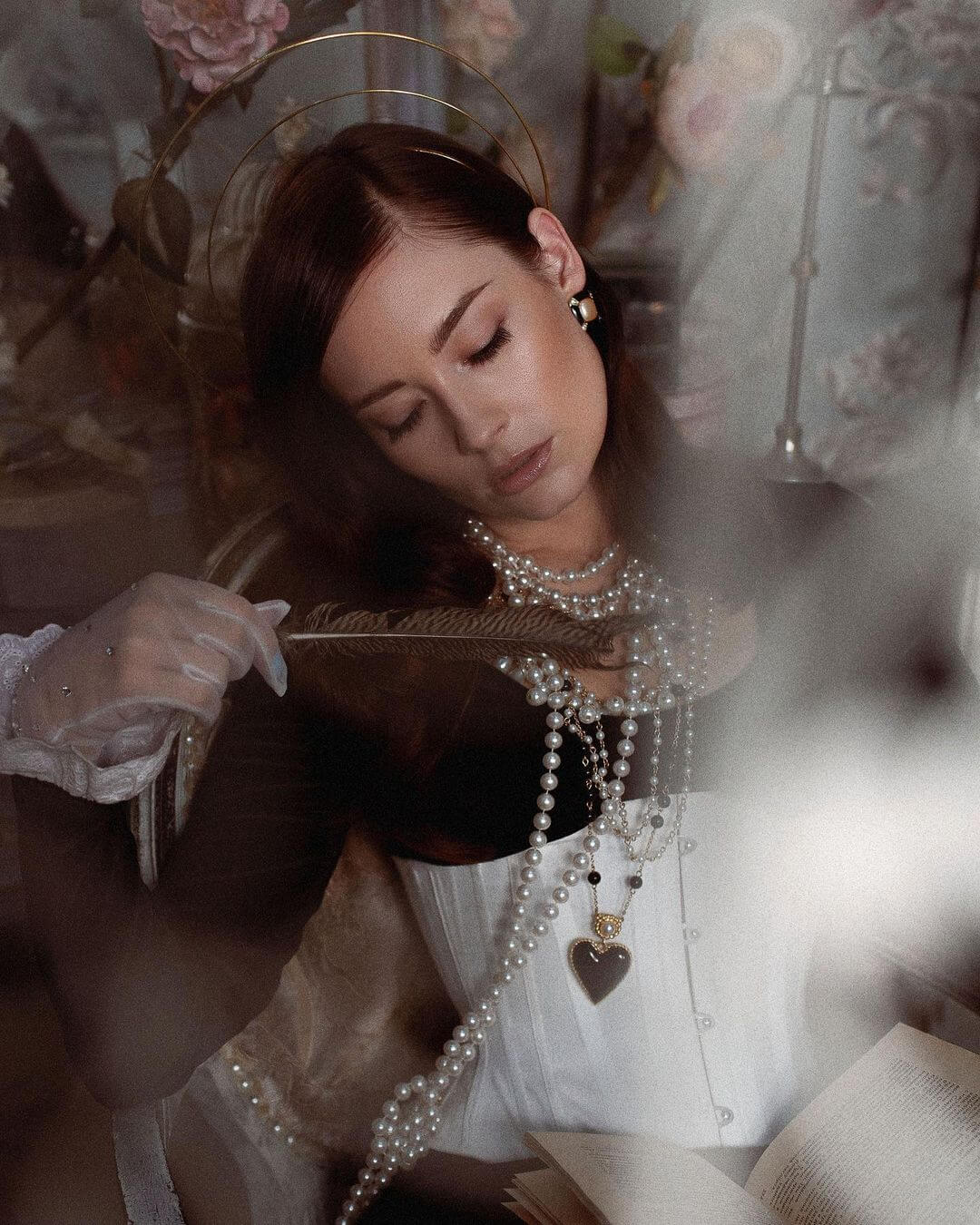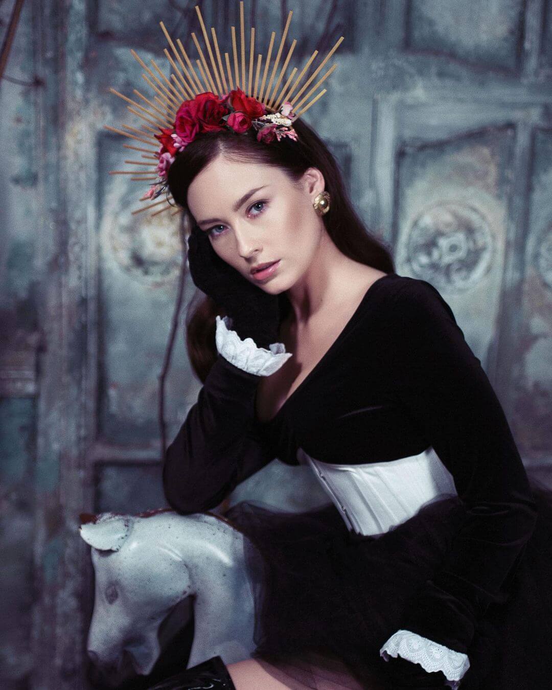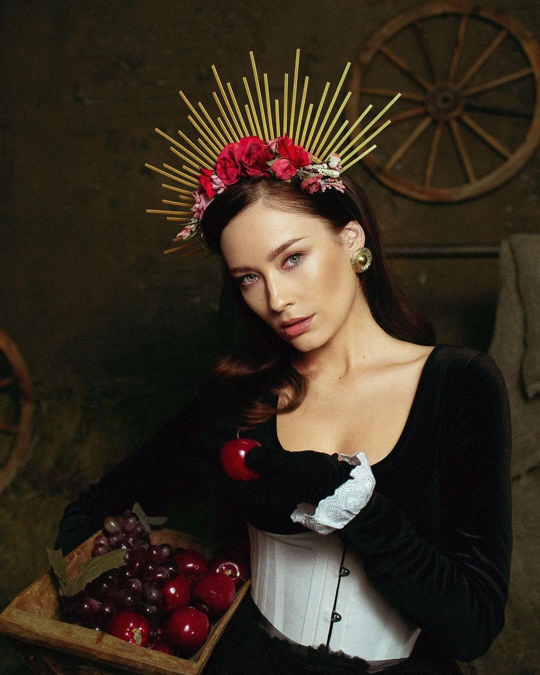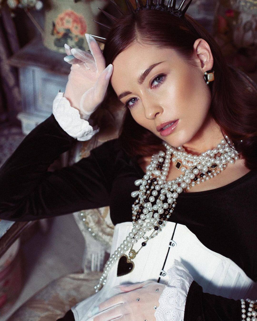 Ova foto-serija deluje kao da crpi inspiraciju iz baroknog slikarstva i simbolike kraljevskih portreta, ali je realizovana kroz savremeni vizuelni pristup. Igra svetla, tekstura tkanina i izraza lica stvara snažan narativ — model je istovremeno ikona i pripovedač. Dramatična kruna, biseri, pliš i korset prizivaju raskoš prošlih epoha, dok njeni izrazi prevazilaze puko poziranje i prerastaju u performans. Uvodni kadar, sa zatvorenim očima i prozirnim velom, podseća na sanjiv ili introspektivan portret. Čitava serija odiše teatralnošću bez preterivanja — ostaje samouvereno umetnička.