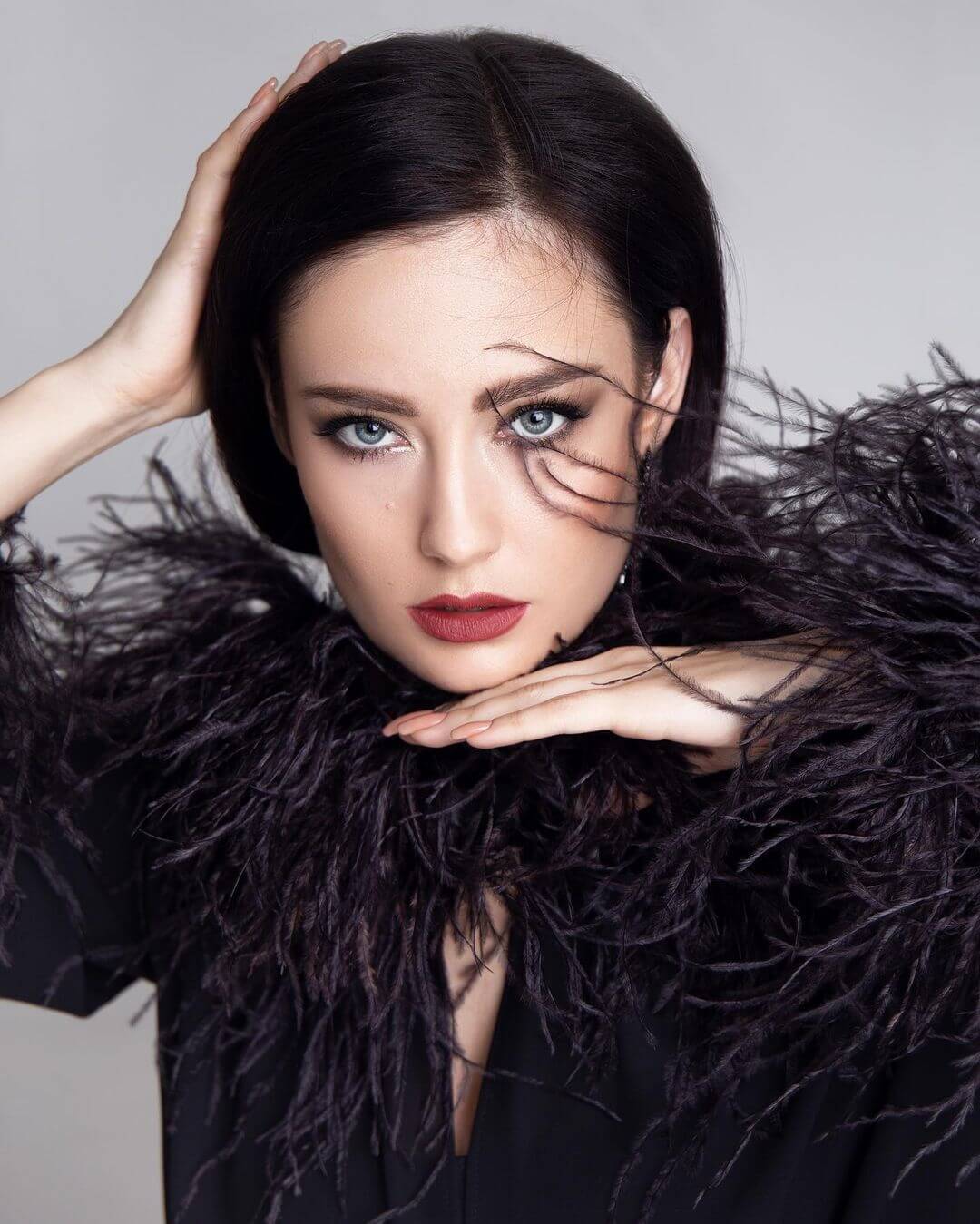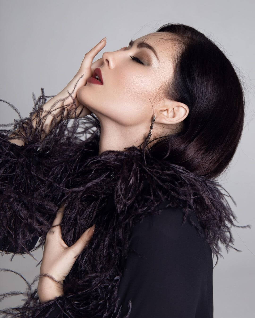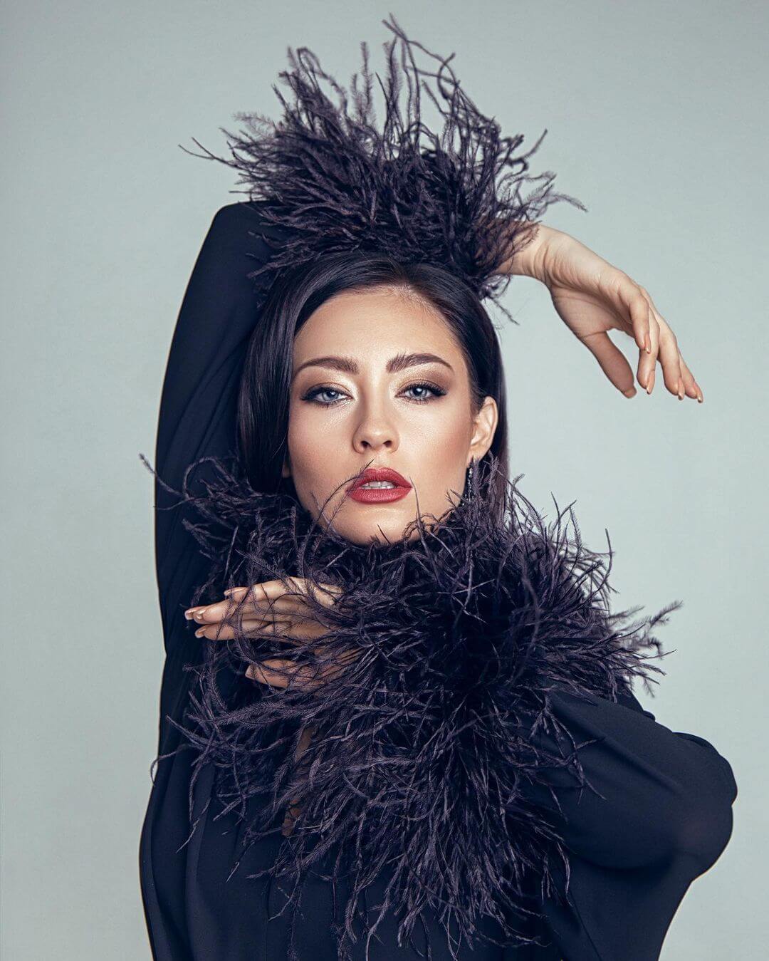 Эта портретная серия определяется выразительной точностью движения и резким контрастом света и тени. Чёрное перьевое одеяние становится визуальной текстурой, усиливающей композицию, а жесты модели создают ритм и структуру кадра. Её взгляд прямой, но не вызывающий; элегантность выражена через контролируемое напряжение и динамичную экспрессию. Особенно выделяется работа с лицом — оно остаётся центральным элементом, меняя эмоции от кадра к кадру, но всегда излучая присутствие. Эти снимки не рассказывают историю — они завораживают своим визуальным языком.